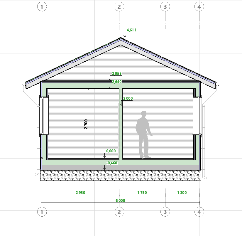Крыша: Простая двухскатная, что обеспечивает эффективный сход осадков, простоту монтажа и возможность обустройства небольшого чердака для хранения.