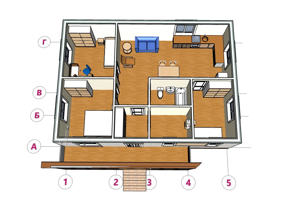 3. Рациональная планировка: Четкое разделение на «грязную» (котельная, прихожая) и «чистую» зоны, изолированные спальни.