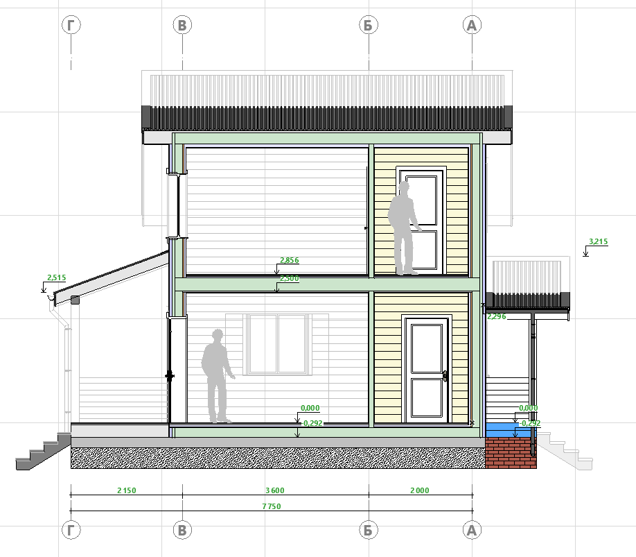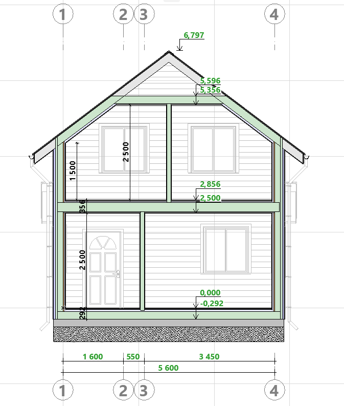 — Этажность: Два этажа. Первый этаж — полноценный, второй (мансардный) — размещен в скатах кровли.