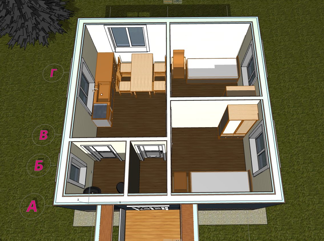 Кухня-гостиная (10,2 кв.м.): Просторное многофункциональное помещение – центральная зона дома. Позволяет разместить компактный кухонный гарнитур с необходимой техникой (двухконфорочная плита, холодильник), обеденный стол на 4-6 человек и зону отдыха с небольшим диваном или креслами. Большие окна обеспечивают хорошую инсоляцию и визуально расширяют пространство.