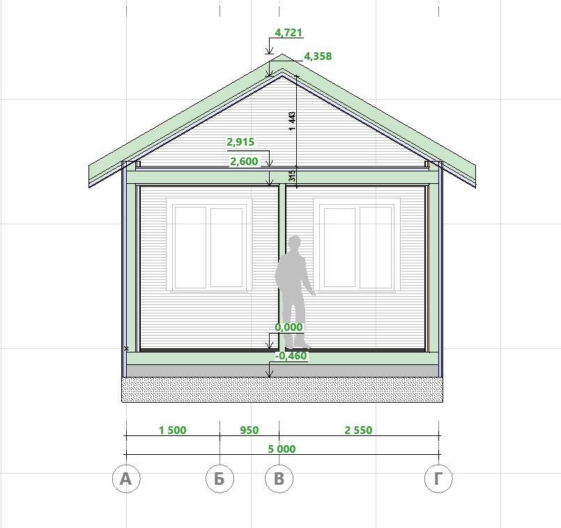 Конструкция кровли: Двускатная, что обеспечивает простой сход снега и возможность обустройства чердака или мансарды в будущем.