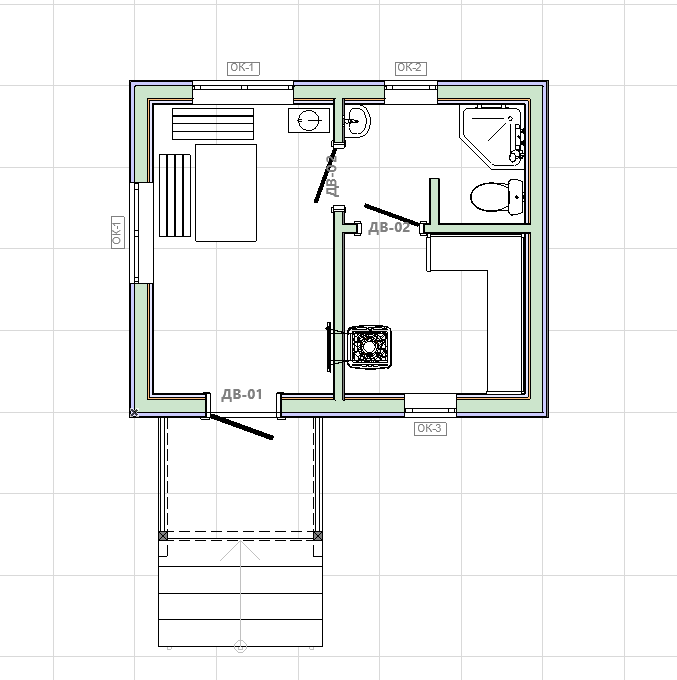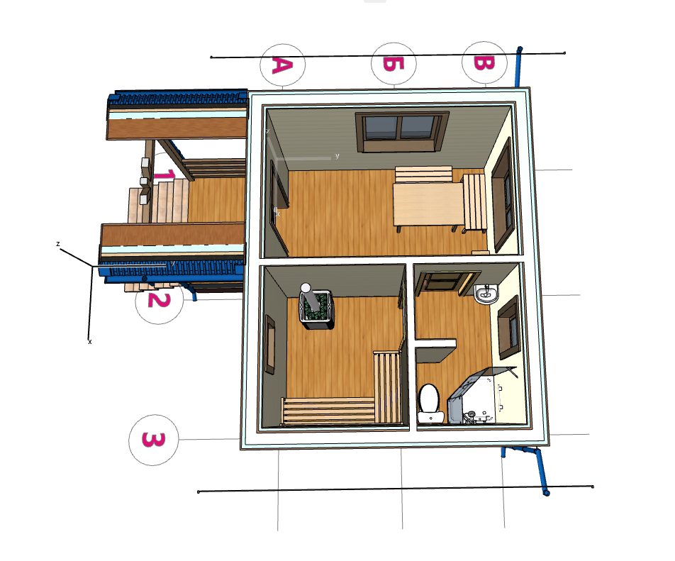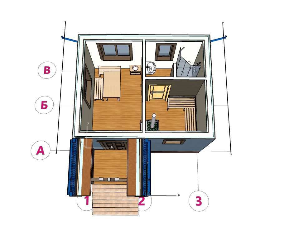 Моечная (помывочная): Площадь 3,2 м². Размещается душевая кабина или поддон со сливным трапом, полки для банных принадлежностей, возможна установка небольшой скамьи. Ключевые требования — эффективная гидроизоляция и вентиляция.